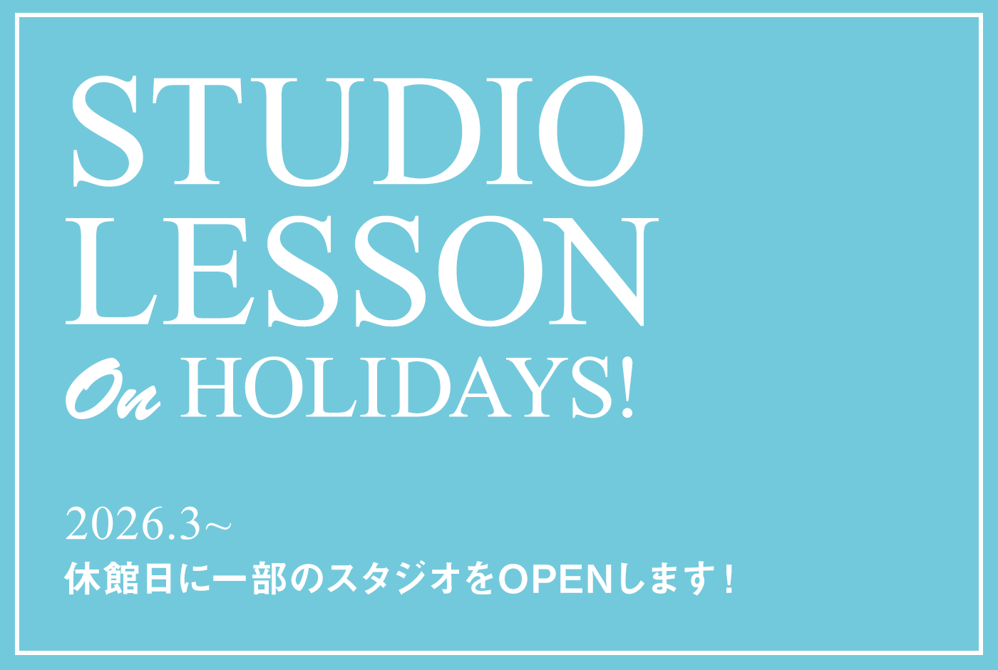 休館日でもレッスンをしたい!方に。 3月より、休館日に一部のスタジオをOPEN! 従来のオンラインレッスンに加え、 休館期間の指定日に スタジオ・オンラインレッスンを開催。 休館中でも休まずにレッスンを受講いただけます。